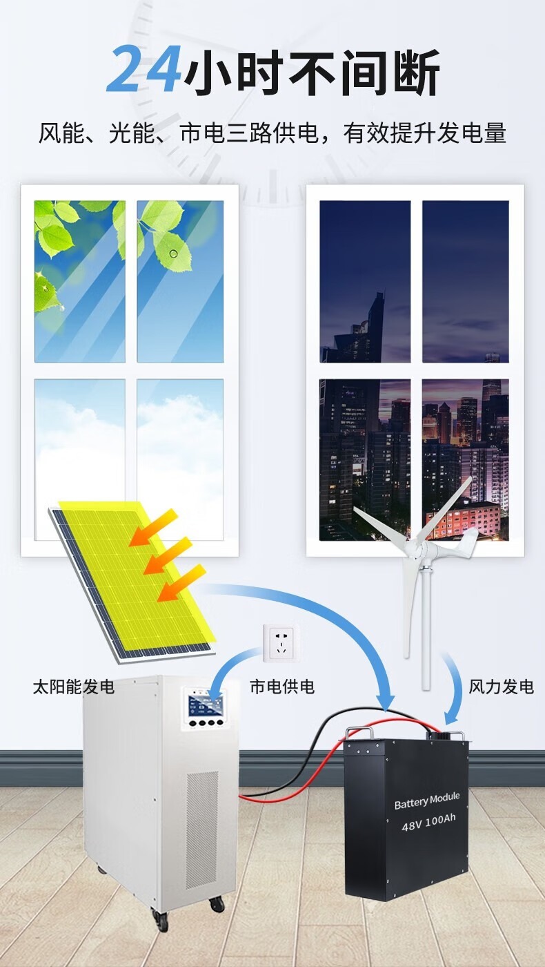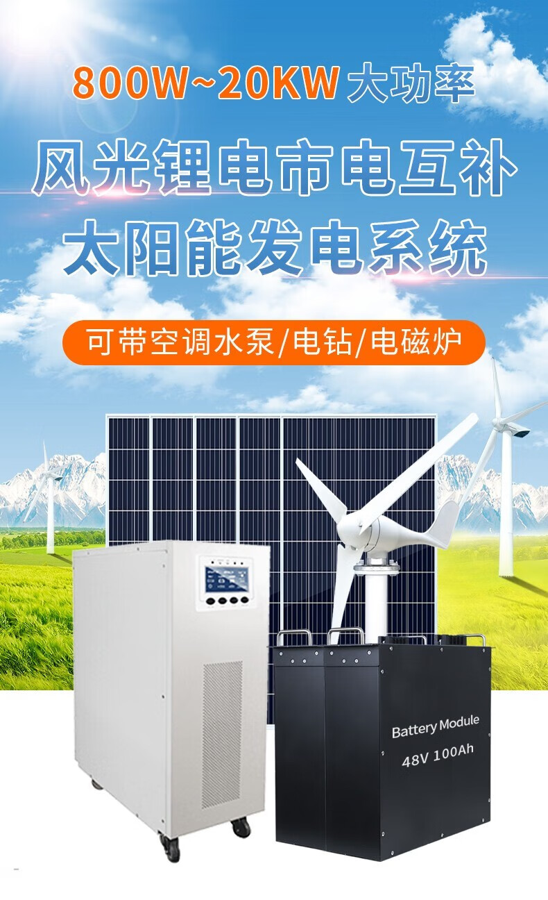 猎钢狼 太阳能发电系统全套家用风光锂电市电互补光伏大系统户外风力 1500W锂电发电系统+风机